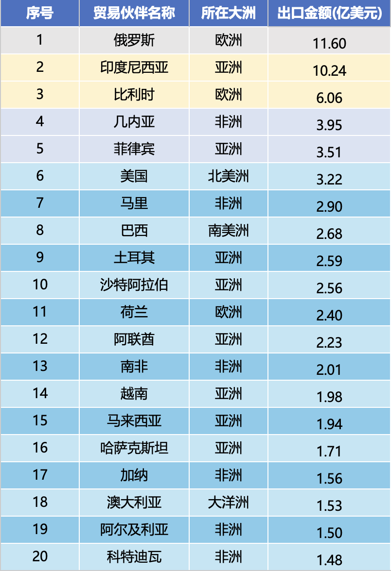 जानेवारी ते डिसेंबर 2025 पर्यंतच्या निर्यात रकमेच्या क्रमवारीनुसार, रशिया ($1.16 अब्ज), इंडोनेशिया ($1.024 अब्ज), बेल्जियम ($606 दशलक्ष), गिनी ($395 दशलक्ष), फिलीपिन्स ($351 दशलक्ष), युनायटेड स्टेट्स ($322 दशलक्ष), माली ($290 दशलक्ष), माली ($290 दशलक्ष) ($259 दशलक्ष), सौदी अरेबिया ($256 दशलक्ष). शीर्ष दहा बाजारांचे एकूण निर्यात मूल्य 4.93 अब्ज यूएस डॉलरवर पोहोचले आहे, जे एकूण निर्यात मूल्याच्या 45.9% आहे, मुख्य बाजारपेठेत उच्च एकाग्रतेसह.
