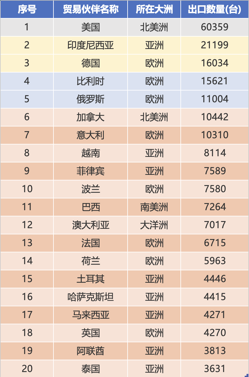जानेवारी ते डिसेंबर 2025 पर्यंतच्या निर्यात प्रमाणांच्या क्रमवारीनुसार, युनायटेड स्टेट्स (60359 युनिट्स), इंडोनेशिया (21199 युनिट), जर्मनी (16034 युनिट), बेल्जियम (15621 युनिट्स), रशिया (11004 युनिट), कॅनडा (10442 युनिट्स) 10442 युनिट्स (10442 युनिट्स), Viet111 युनिट्स (Viet111 युनिट्स), युनिट्स), फिलीपिन्स (7589 युनिट्स), आणि पोलंड (7580 युनिट्स). टॉप टेन मार्केटमधील एकूण निर्यात प्रमाण 168000 युनिट्सपर्यंत पोहोचले आहे, जे एकूण निर्यात प्रमाणाच्या 53.1% आहे, स्केल इफेक्ट हायलाइट करते.