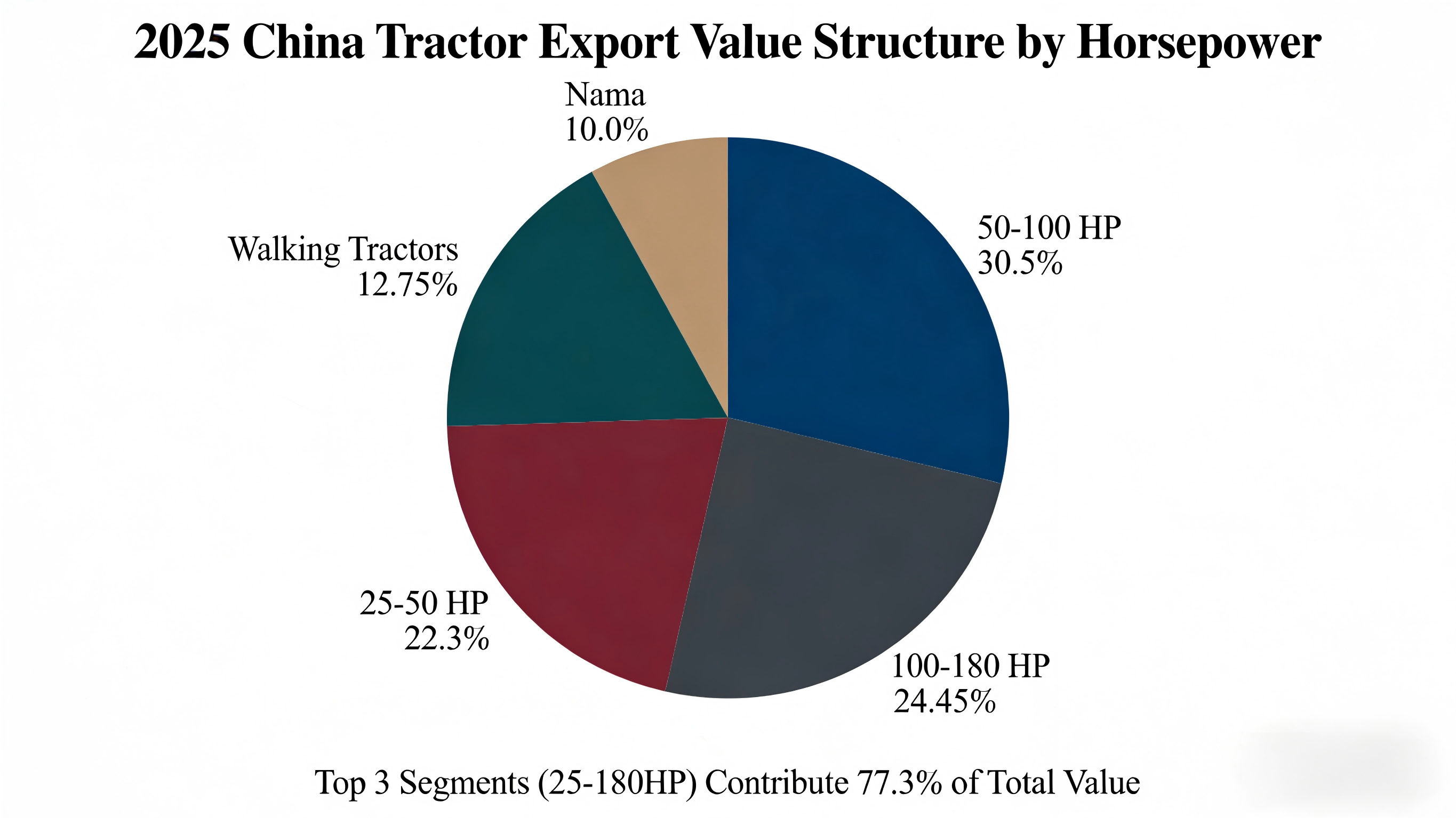 2025 मध्ये, चीनमधील ट्रॅक्टरच्या निर्यात मूल्याने एक वेगळा अश्वशक्ती विभाग स्तरीकरण नमुना दर्शविला. त्यापैकी, 50-100 अश्वशक्ती (HP) मॉडेल्सचा वाटा 30.5% होता आणि ते निर्यात मूल्यामध्ये सर्वात मोठे योगदान देणारे बाजार विभाग बनले, जे जागतिक मोठ्या प्रमाणावर कृषी आणि आर्थिक पीक लागवड क्षेत्रातील मध्यम-अश्वशक्ती उपकरणांची मजबूत मागणी दर्शवते. 100-180 हॉर्सपॉवर हाय-एंड मॉडेल्सचा वाटा 24.45% होता, तर 25-50 अश्वशक्तीच्या मध्यम-श्रेणी मॉडेल्सचा वाटा 22.3% होता. या तीन कोर अश्वशक्ती विभागांनी (25-180 HP) एकत्रितपणे एकूण निर्यात मूल्याच्या 77.3% योगदान दिले, जे संयुक्तपणे चीनच्या ट्रॅक्टर निर्यातीचे मूल्य स्तंभ बनवतात. हे केवळ विविध स्केलच्या कृषी उपकरणांसाठी विदेशी बाजारपेठेतील विविध मागण्यांचे प्रतिबिंबित करत नाही तर देशांतर्गत मध्यम ते उच्च-अंत ट्रॅक्टर उत्पादनांच्या स्पर्धात्मकतेच्या निरंतर सुधारणाची पुष्टी करते. याव्यतिरिक्त, चालणारे ट्रॅक्टरचे प्रमाण 12.75% होते, जे प्रामुख्याने लहान-शेतकरी आणि अविकसित प्रदेशांच्या मूलभूत कृषी गरजांशी संबंधित होते. नामा श्रेणीचा वाटा 10.0% होता आणि या उत्पादनांचे मूल्य योगदान तुलनेने मर्यादित होते. एकूणच, सध्याची निर्यात मूल्य रचना चीनच्या ट्रॅक्टर निर्यातीची वैविध्यपूर्ण बाजारपेठेची मांडणीच दर्शवत नाही तर मध्यम ते उच्च श्रेणीतील मॉडेल्स निर्यात मूल्याच्या वाढीसाठी मुख्य प्रेरक शक्ती बनल्या आहेत. जागतिक कृषी यांत्रिकीकरण प्रक्रिया वेगवान झाल्यामुळे, उच्च श्रेणीतील मोठ्या-अश्वशक्ती मॉडेलचे मूल्य प्रमाण आणखी वाढेल अशी अपेक्षा आहे. देशांतर्गत उद्योगाला जागतिक कृषी यंत्रसामग्री बाजारपेठेत आपले स्पर्धात्मक स्थान मजबूत करण्यासाठी तांत्रिक सुधारणा आणि उत्पादन पुनरावृत्तीवर सतत लक्ष केंद्रित करणे आवश्यक आहे.